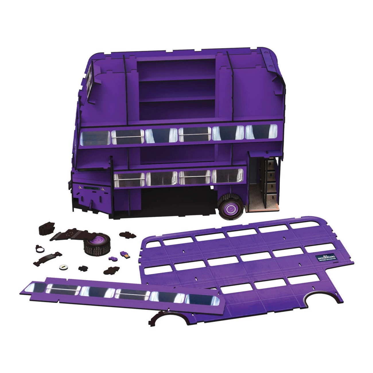 Der Knight Bus ist ein lilafarbener AEC Regent III RT mit drei Etagen, der gestrandeten Mitgliedern der Zauberer Gemeinschaft mit öffentlichen Verkehrsmitteln hilft. .