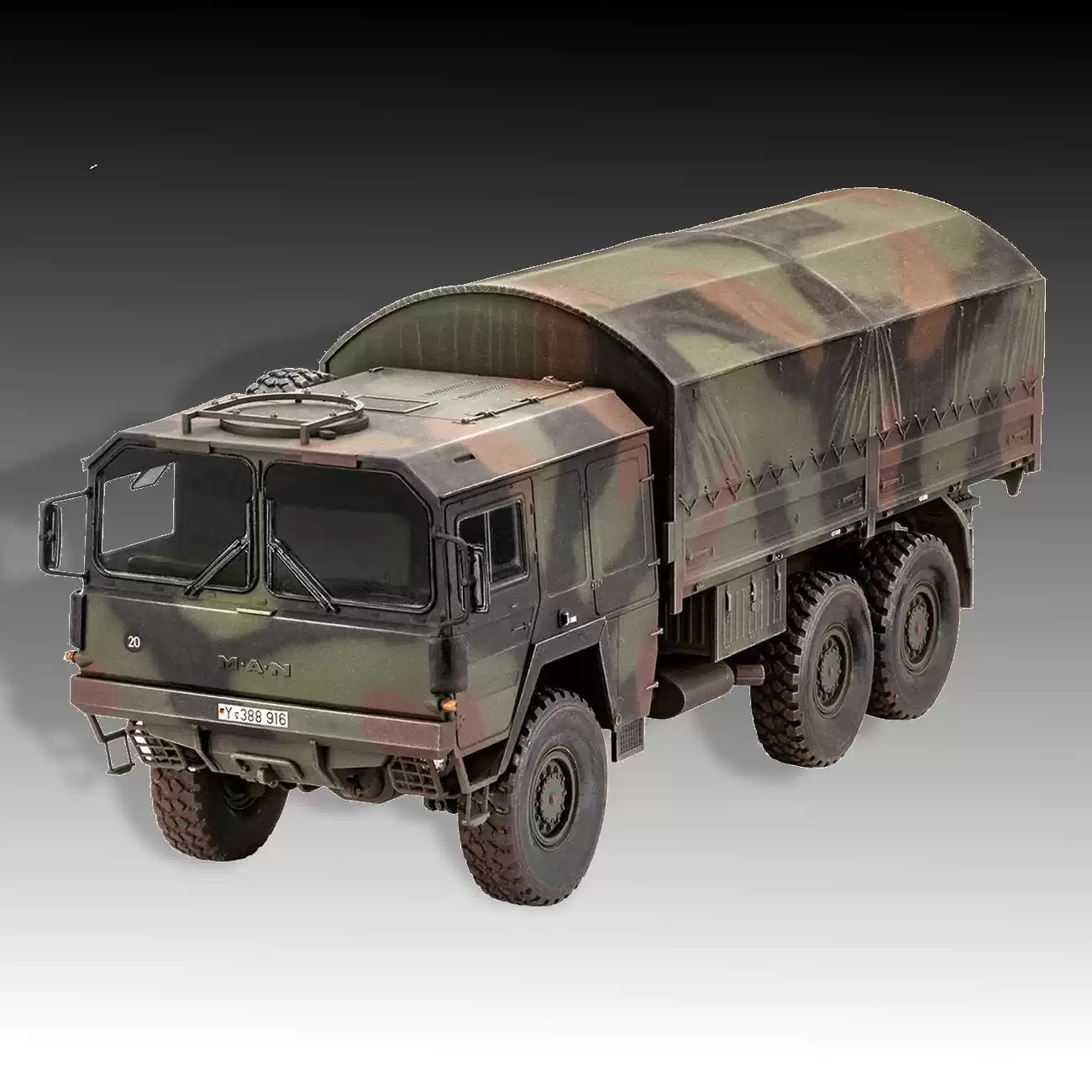 Modellbausatz des MAN 7t Milgl. Dieser wird von der Bundeswehr zur Materialversorgung der Truppe auch in schwerem Gelände eingesetzt. Er ist aufgrund seines 6×6-Allradantriebs und der hochbeweglichen Achsen für diese schwierige Aufgabe ideal geeignet und gilt zu Recht als einer der besten LKW seiner Klasse weltweit.