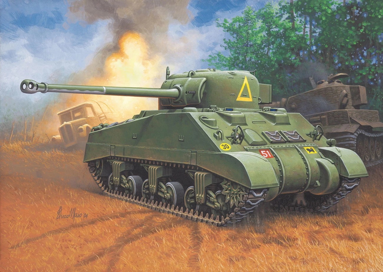 Daten Sherman Firefly: Baujahr: 1944 – Herkunftsland: USA, Großbritannien – Länge: 5,89 / 7,82m – Breite: 2,67m – Höhe: 2,75m – Antriebsleistung: 425 PS – Höchstgeschwindigkeit: 40 km/h – Reichweite: 145 / 201km – Gewicht: 33 t (Kampfpanzer )