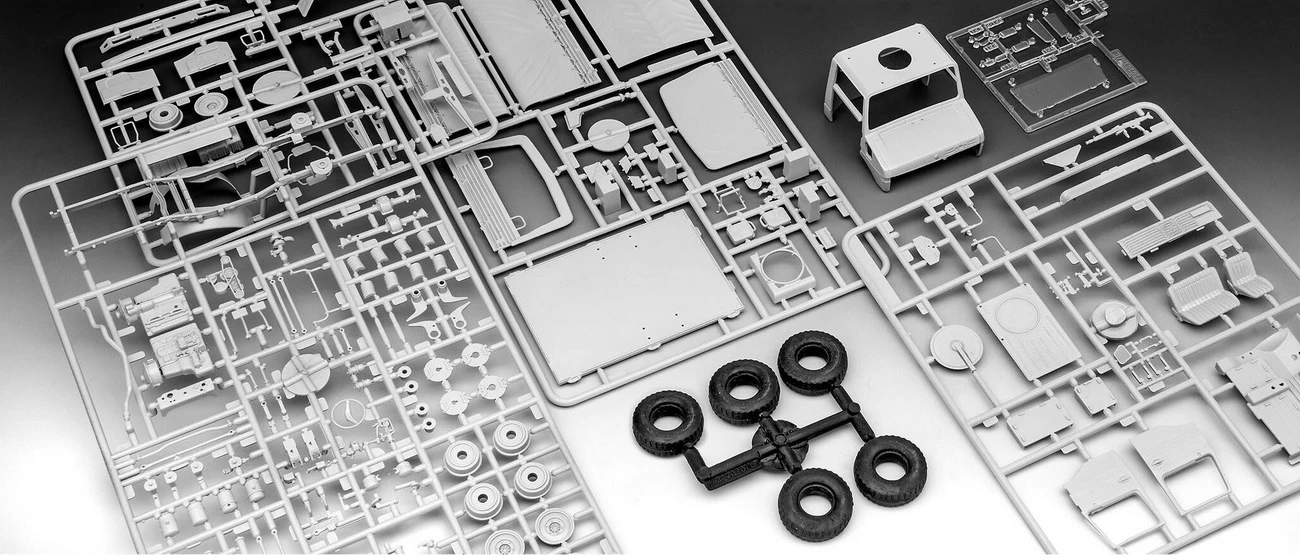 Modellbaussatz des Unimog 2t milgl. Das den militärischen Anforderungen angepasste und äußerst geländegängige Fahrzeug wird bei allen Teilstreitkräften eingesetzt. Als Bewaffnung dient ein MG 3 auf einer Drehringlafette.