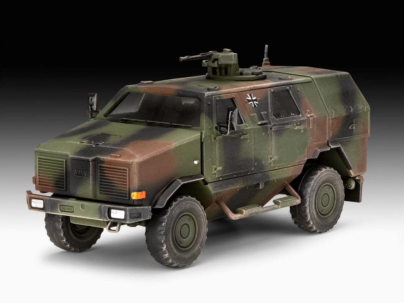 Modellbausatz des gepanzerten Transportfahrzeugs ATF Dingo 1. Der Dingo 1 bietet mit seinem speziellen V-förmigen Unterboden maximalen Schutz gegen Minen und IEDs.