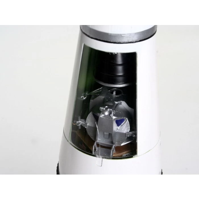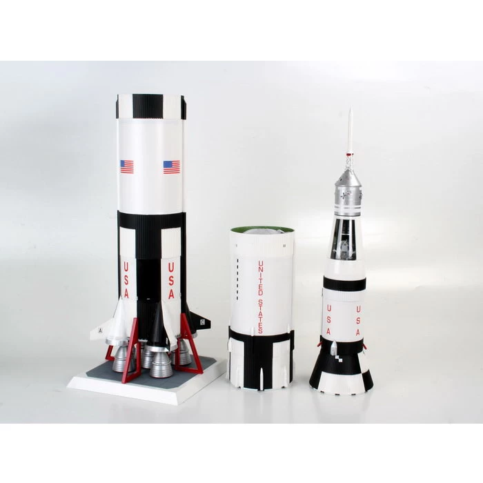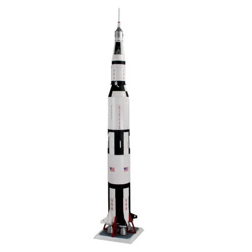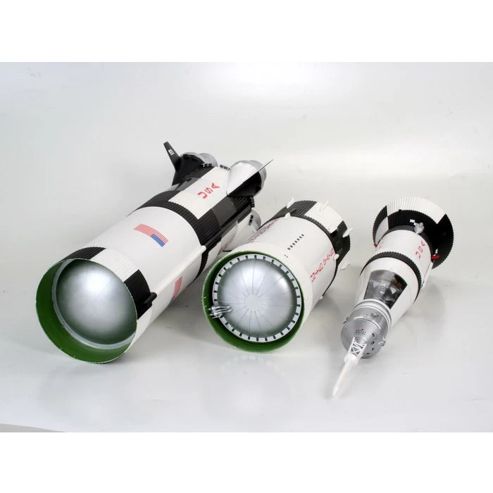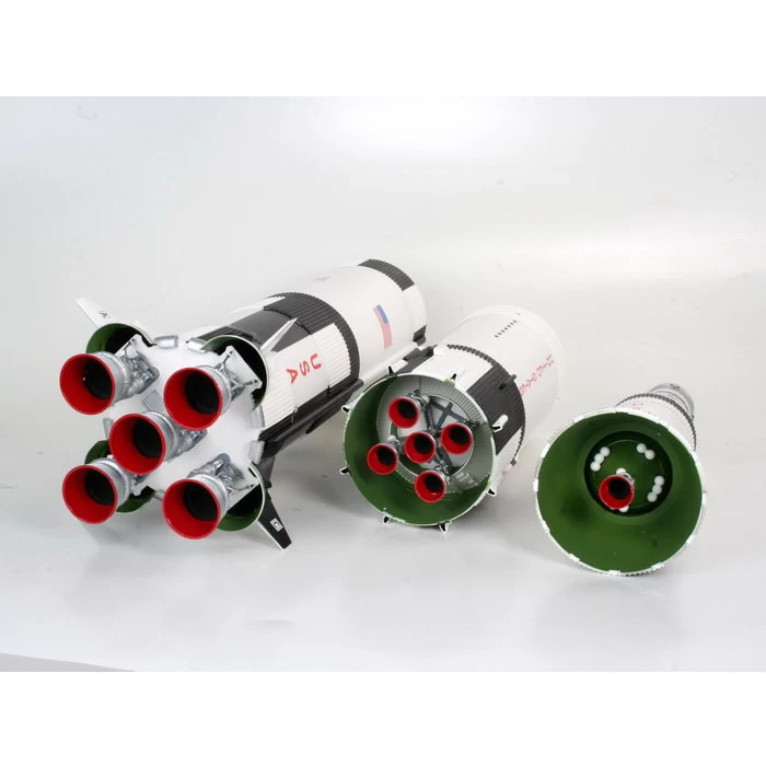 Das imposante Saturn V-Modell hat eine Höhe von 1,14 Meter und wird auf einer mit Stützen versehenen Plattform gelagert. Die Raketenstufenringe bestehen zum Teil aus bereits vorgedruckten Polystyrolstreifen. Die 3 großen Raketenstufen sind mit detaillierten Schubdüsen versehen, zum Teil sind auch Helium-Kugelbehälter vorhanden. Im oberen Bereich der 3. Raketenstufe erlaubt der durchsichtige Teil der Schutzhülle einen Einblick auf die darin befindliche Mondlandefähre mit Servicemodul. Die Kommando-Kapsel enthält eine Inneneinrichtung sowie eine Astronautenfigur. Zusätzlich gibt es noch eine Mondstruktur-Displayplatte mit der verschiedene Einsatzphasen der Mondlandefähre nachgestellt werden können. Die umfangreichen Abziehbilder erlauben eine originalgetreue Wiedergabe der Originalbeschriftung.