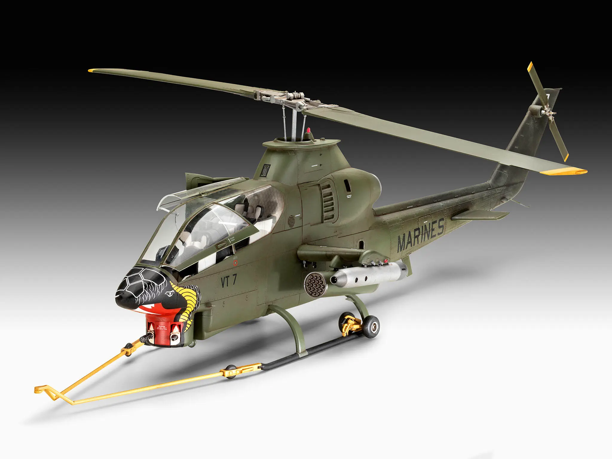 Modellbausatz der legendären Bell AH1 Cobra. Der Mitte der 1960er Jahre produzierte Hubschrauber gilt als der erste echte Kampfhubschrauber und kam zum ersten Mal im Vietnamkrieg zum Einsatz. Die Bezeichnung „Cobra“ steht für die schwere Bewaffnung der ursprünglich als Transporthubschrauber konzipierten Helikopter.