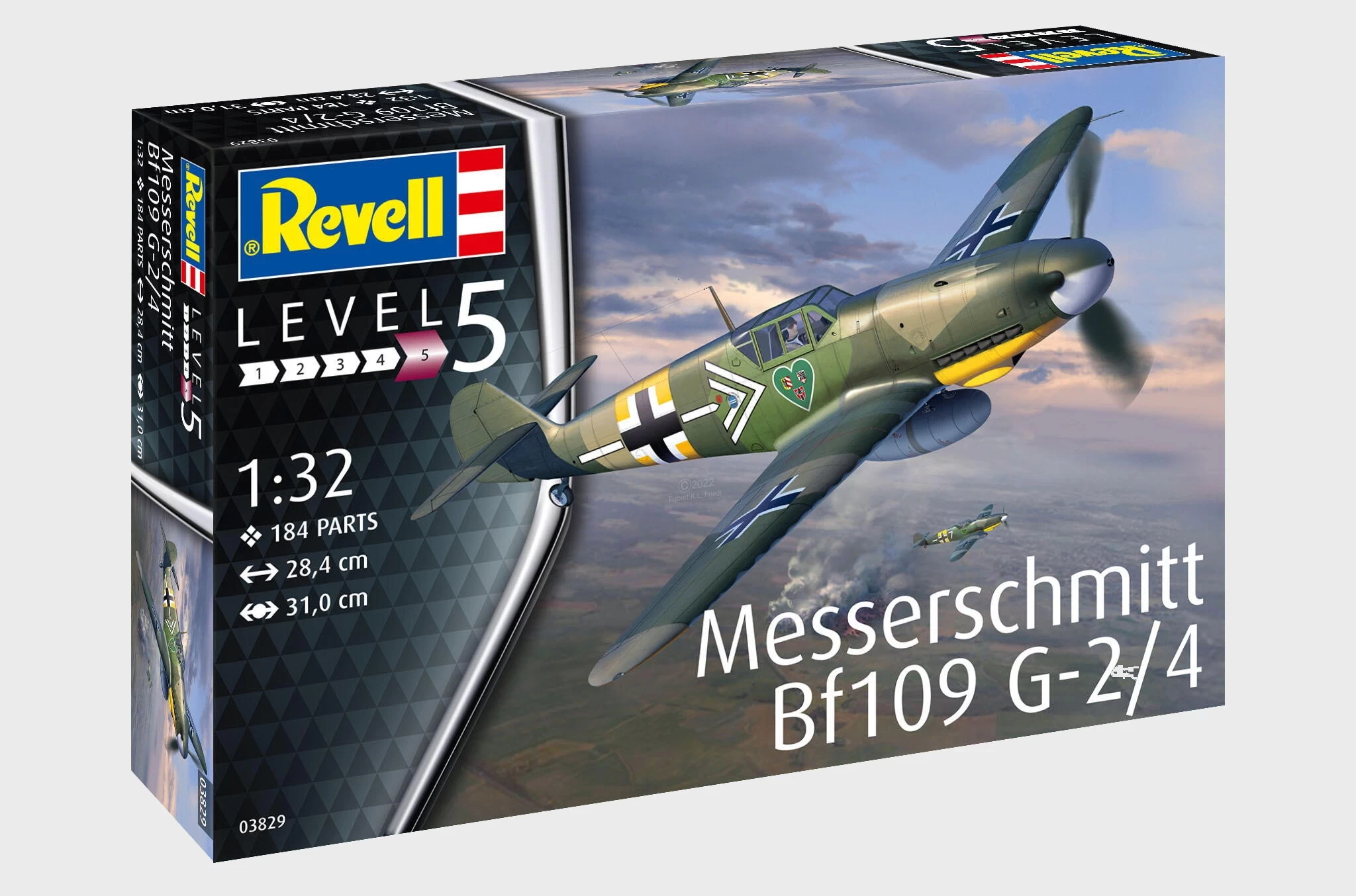 Daten des Modell Messerschmitt Bf109 G-2/4 (03829): – Maßstab: 1:32 – Länge: 28,4cm – Spannweite: 31cm – Schwierigkeitsgrad: 5 von 5 – Einzelteile: 184