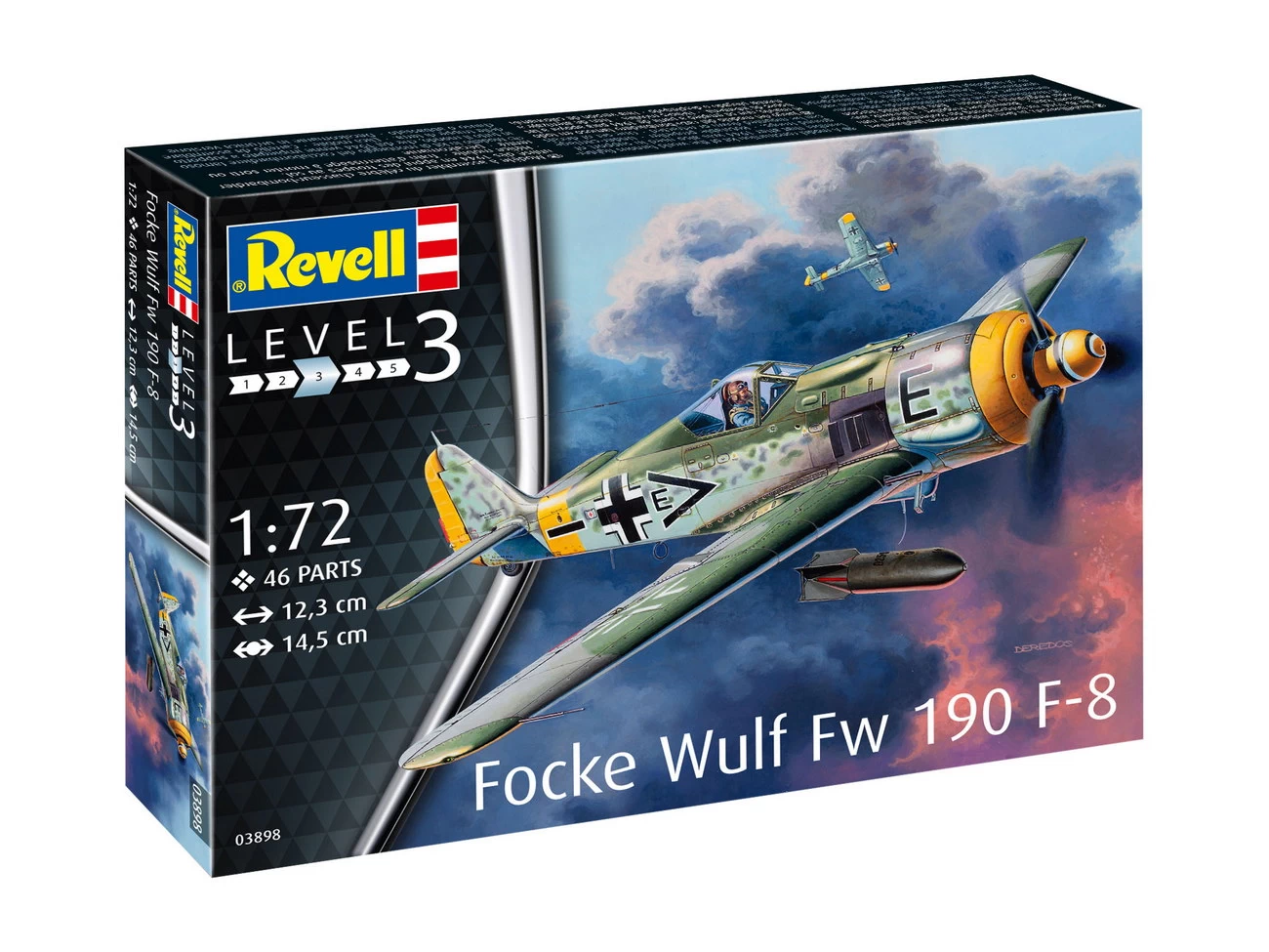 Daten des Modell Focke Wulf Fw190 F-8 (03898): – Maßstab: 1:72 – Länge: 12,3cm – Spannweite: 14,5cm – Schwierigkeitsgrad: 3 von 5 – Einzelteile: 46