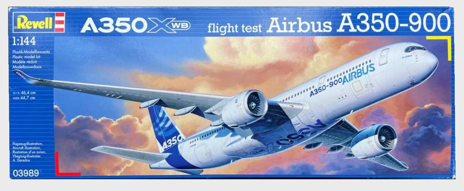 Daten des Modell Airbus A350-900 (03989): – Maßstab: 1:144 – Länge: 46,40cm – Spannweite: 44,70cm – Schwierigkeitsgrad: 4 von 5 – Einzelteile: 120