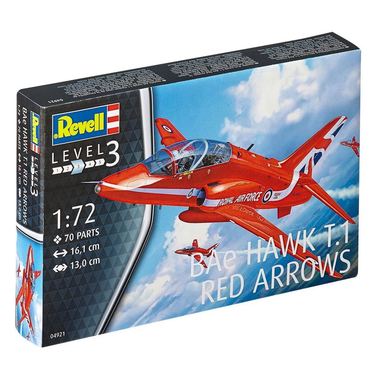 Daten des Modell BAe Hawk T.1 Red Arrows (04921): – Maßstab: 1:72 – Länge: 16,1cm – Spannweite: 13cm – Schwierigkeitsgrad: 3 von 5 – Einzelteile: 70