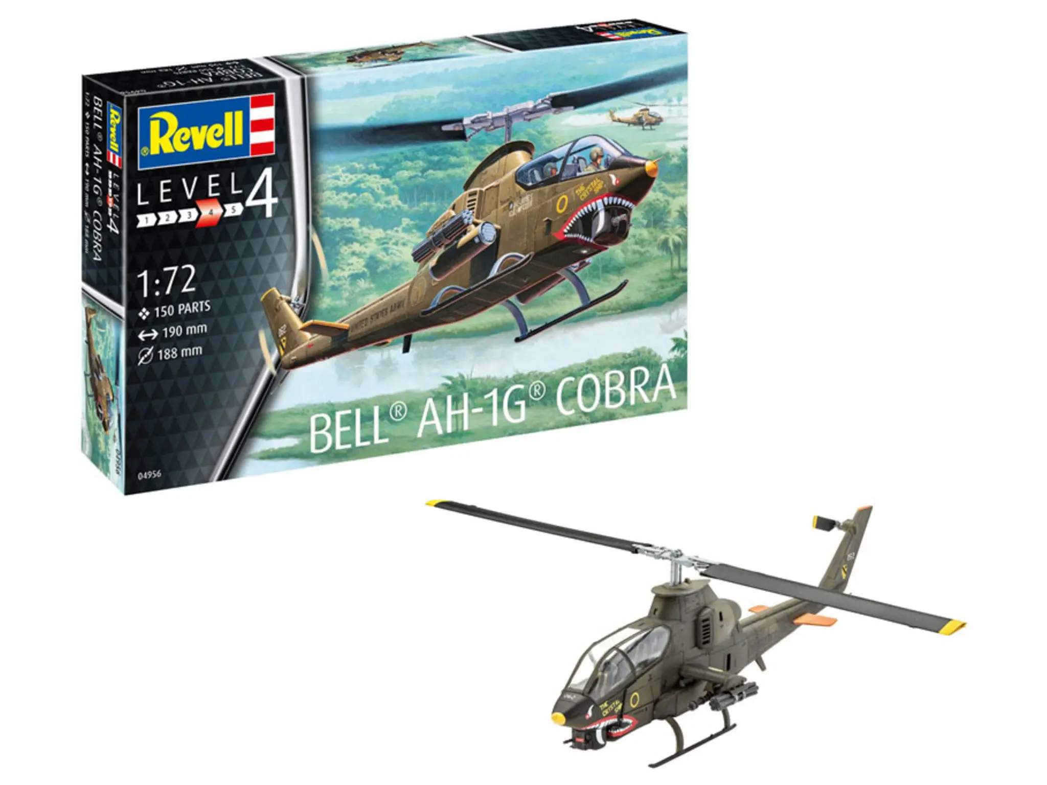 Daten des Modell Bell AH-1G Cobra (04956): – Maßstab: 1:72 – Länge: 19cm –Rotordurchmesser: 18,8cm – Schwierigkeitsgrad: 4 von 5 – Einzelteile: 150
