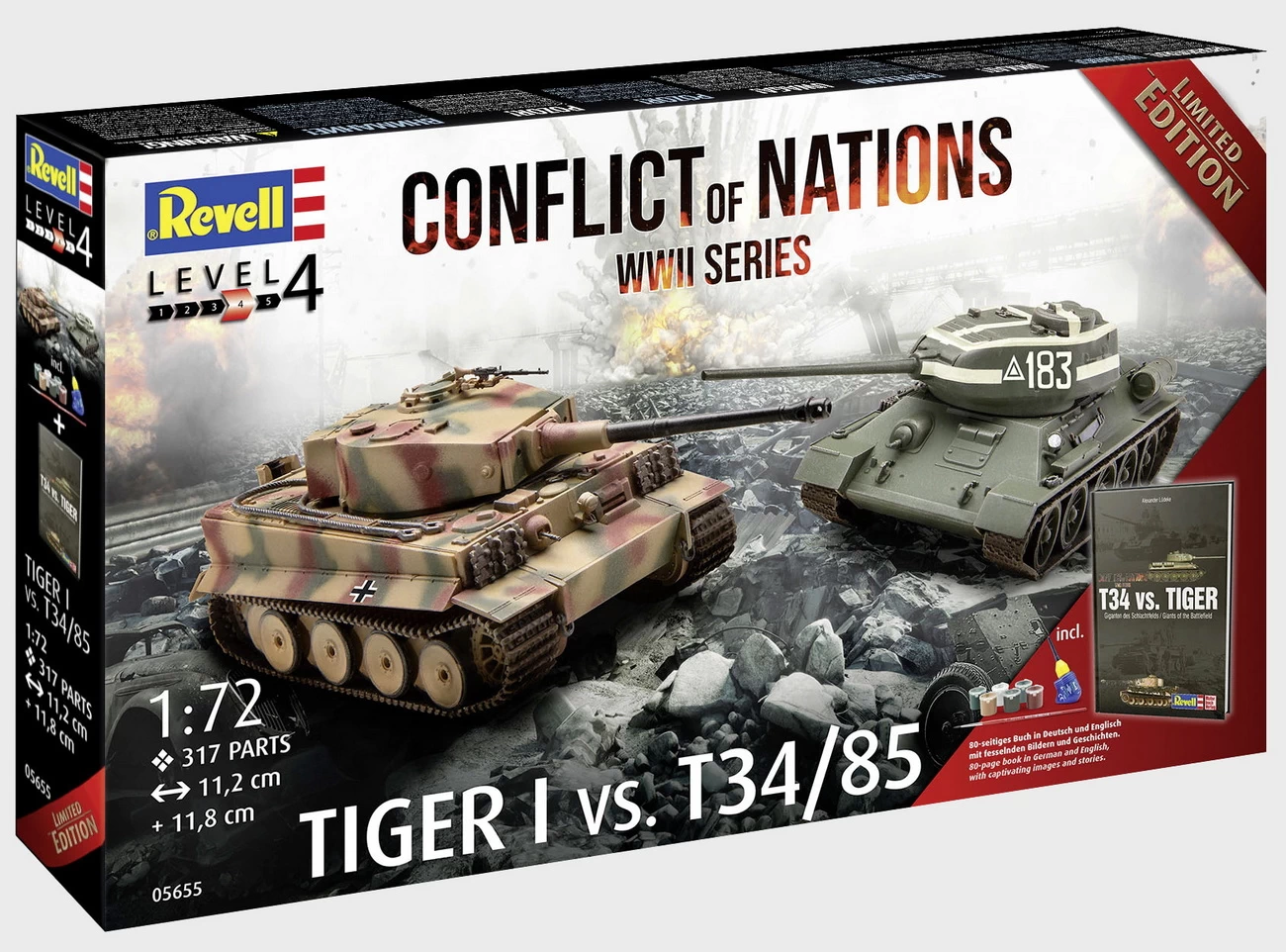 Tauchen Sie ein in die faszinierende Welt der Panzerhistorie mit dem exklusiven und limitierten Conflict of Nations Set. Dieses Set enthält nicht nur präzise Modellbaussätze der legendären Panzer Tiger 1 und T34/85, sondern auch ein 80-seitiges Buch voller historischer Einblicke und fesselnder Bildmaterialien in den Sprachen Deutsch und Englisch. . Modellbausätze des Tiger 1 & T34/85 . Enthält Farben, Kleber und Pinsel sowie eine beeindruckende Diorama Verpackung . 80-seitiges Buch in Deutsch und Englisch mit fesselnden Bildern und Geschichten