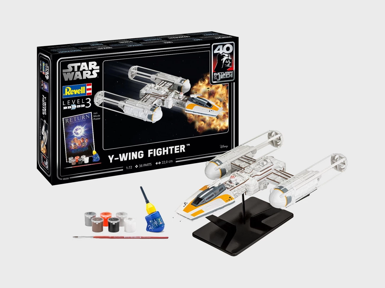 Daten des Modell Geschenkset Y-wing Fighter (05658): – Maßstab: 1:72 – Breite: 11,1cm – Länge: 22cm – Höhe: 7,6cm – Schwierigkeitsgrad: 3 von 5 – Einzelteile: 38