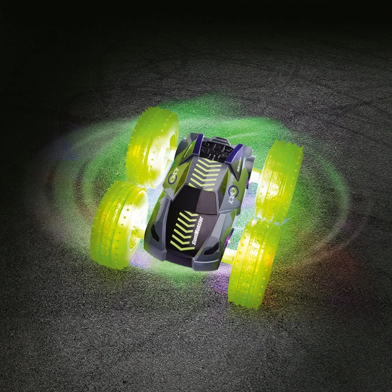 Kraftvoll meistert das StuntMonster 1080 jedes Hindernis das sich ihm in den Weg stellt, 180° Überschläge und 360° Spins sind dabei ein Kinderspiel! Schnelligkeit und Wendigkeit verdankt er kraftvollem Allradantrieb, der zugleich als präzise Steuerung mittels der 2CH-GHz Fernsteuerung dient. Die transluzenten Räder mit LED Beleuchtung zeigen auch im dunkeln wo es lang geht. Sofort einsatzbereit, keine lange Ladezeit durch Einsatz von AA-Batterien.