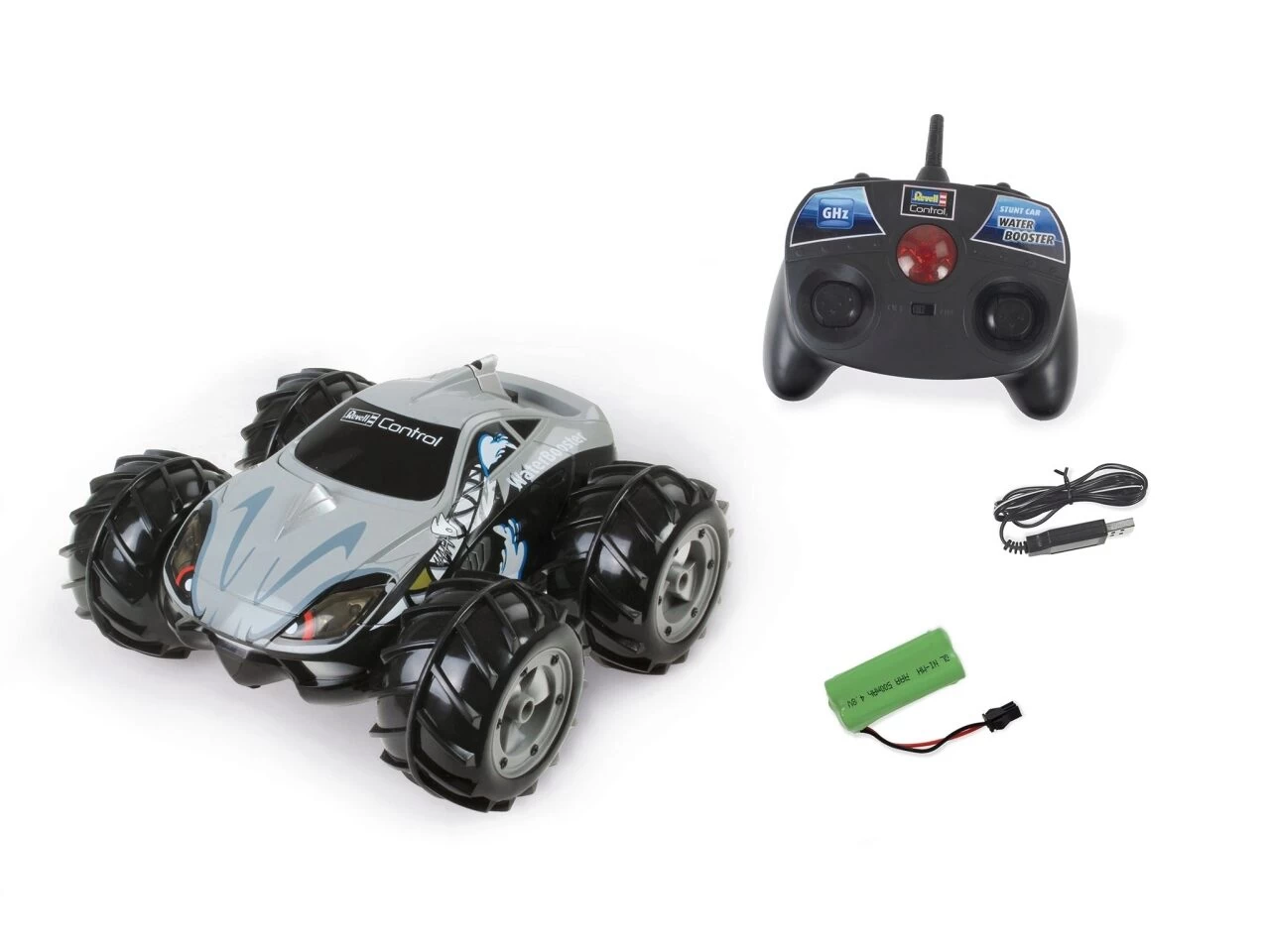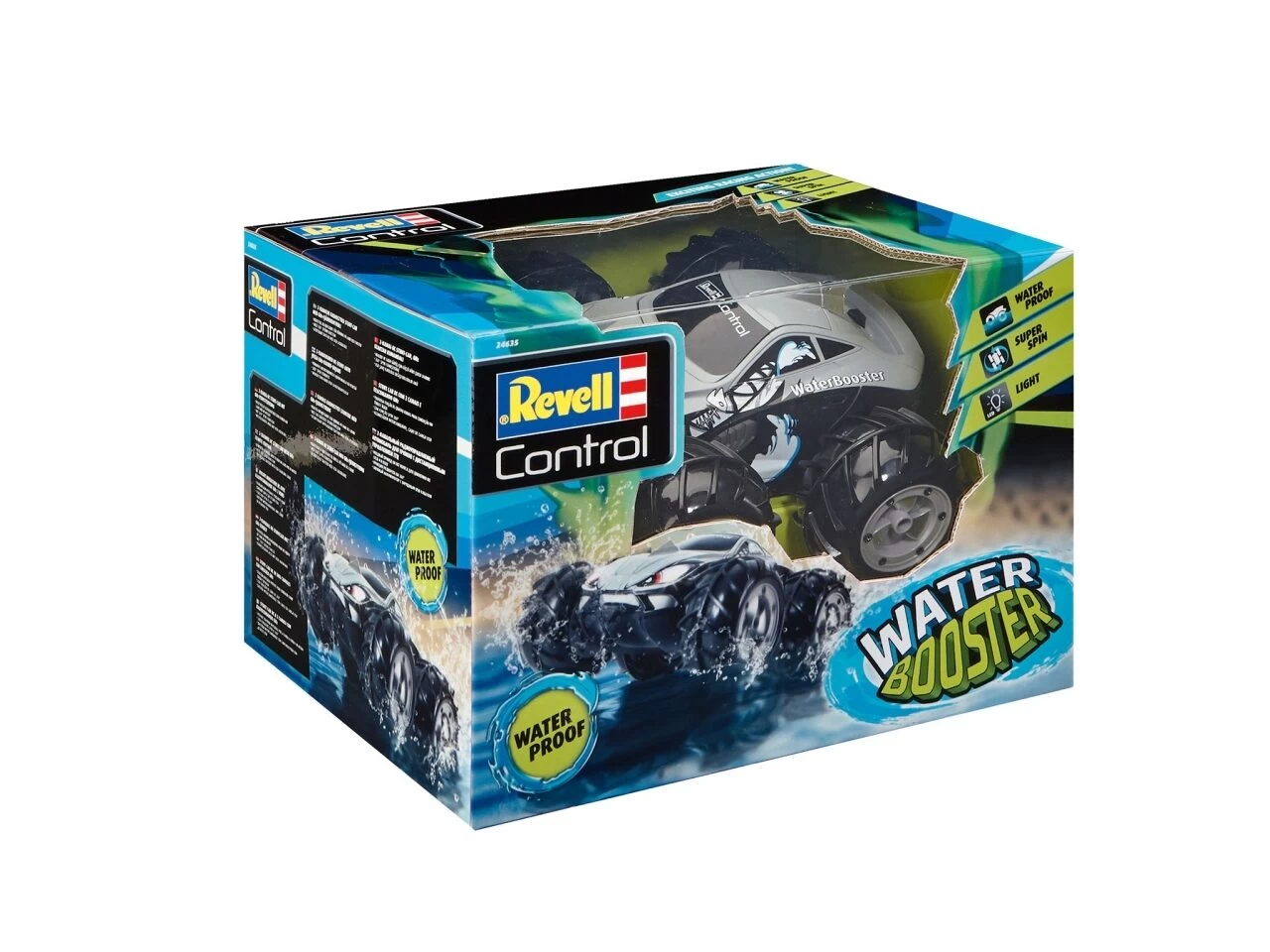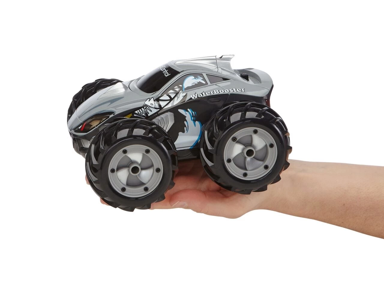 RC-Car-Action zu Land und zu Wasser verspricht der neue WaterBooster. Ob wilde Spins oder heiße Rennen an Land, mit einem Sprung ins Wasser, verdoppelt sich der Fahrspaß. Die großen Reifen wirken dabei wie Schaufelräder, die das Car im Wasser vorantreiben. Für volle Kontrolle sorgt die handlicher 2CH-GHz-Fernsteuerung und um maximale Traktion kümmern sich die griffigen Off- und On-Road/Water-Reifen – allein oder im Team mit Freunden.