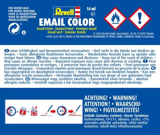 Revell Color ist ein Kunstharz-Emaillelack, der die Kunststoffoberfläche von Plastikmodellen nicht angreift. Aus der bei vielen Bastlern beliebten 14-ml-Lackdose können aber auch viele andere Materialien bemalt werden. Alle Farbtöne – außer Signalfarbe – sind untereinander mischbar und können mit Revell Color Mix verdünnt werden. So kann der Lack nicht nur mit dem Pinsel, sondern auch mit einer Spritzpistole aufgebracht werden.