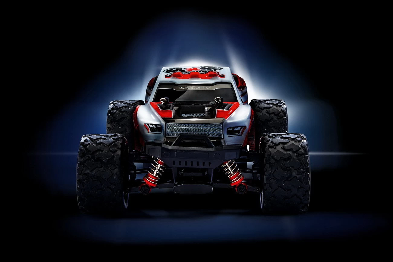 RC Monster Truck 1:18 mit bulligen Reifen und Allrad Antrieb und proportionaler Lenkung Attraktivem Thermo-Form-Body mit Kunststoff Überrollkäfig Einzelradaufhängung, Differential vorne und hinten sowie Stoßdämpfer Extra stabilem Chassis und Rammschutz High Speed bis zu 50 km/h mit kraftvollem Elektromotor, Li-Ion-Akku und USB-Ladekabel