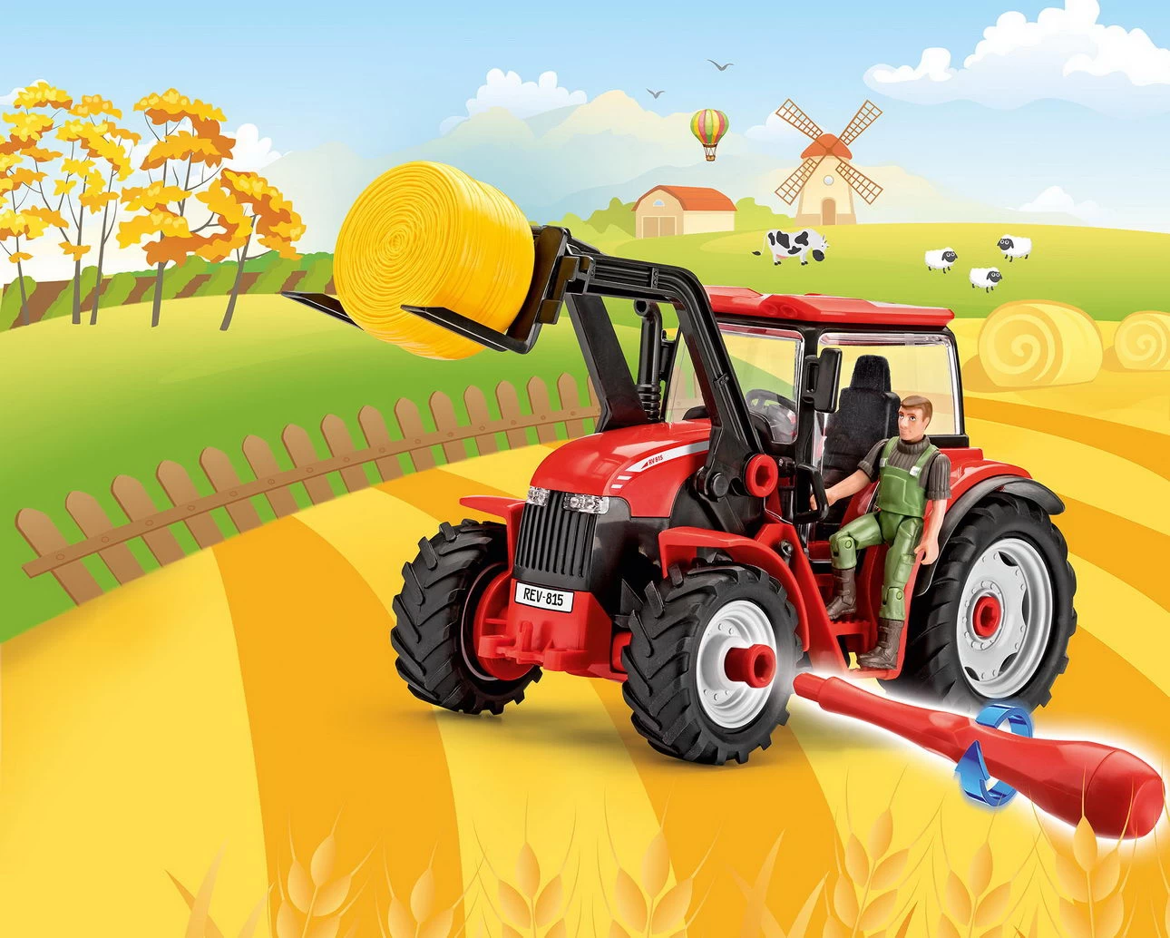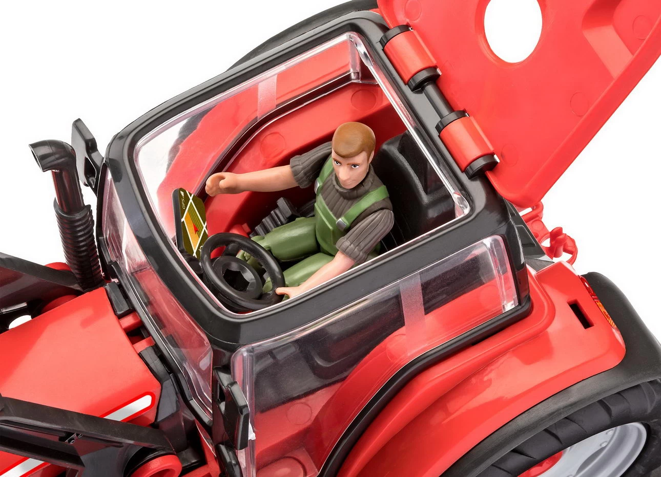 Auf die Felder hinaus! Mit diesem Traktor mit beweglichemFrontlader sind Sie für Arbeiten auf dem Feld bestens gerüstet. Führen Sie den Junior Kit Schraubendreher durch das Kabinendach in das Lenkrad und Sie können Ihren Traktor wirklich steuern. Ein Bauer steht Ihnen auch zur Seite, während Sie arbeiten. Die Figur ist voll beweglich und kann im Sitzen oder Stehen am Traktor arbeiten.